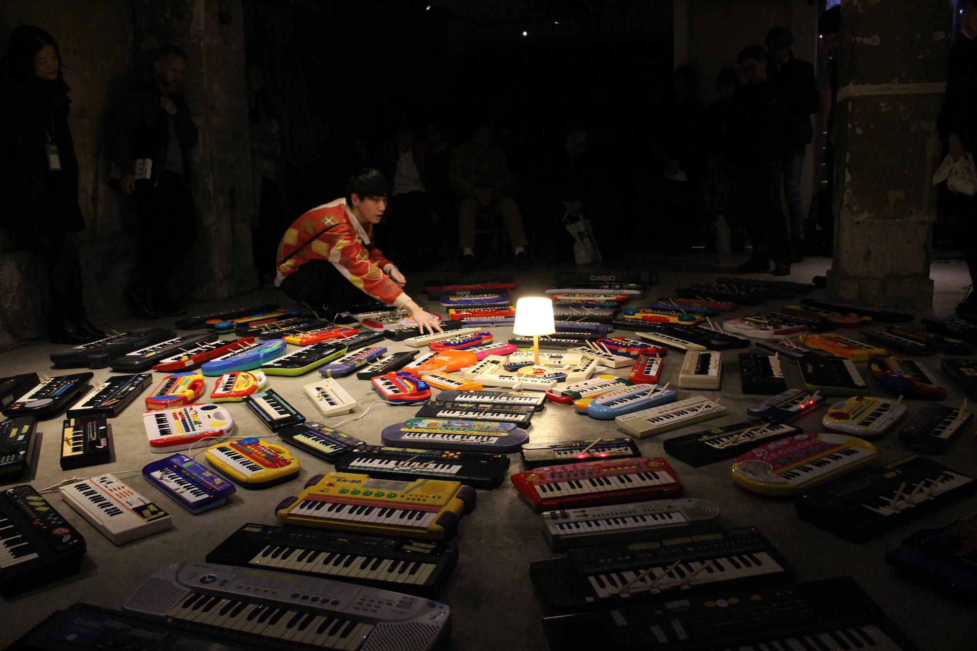 The music of multi-instrumental sound artist ASUNA has reshaped multiple facets of the experimental music scene of Japan, from ambient and drone to improvisation. His landmark work 100 Keyboards is a site-specific listening experience in which one hundred cheap plastic keyboards play the same key, generating an undulating sonic harmony both mesmerising and mysterious. The crowd of sounds comes to take on its own kind of mass, while subtle acoustic variations emerge, hover and retreat.